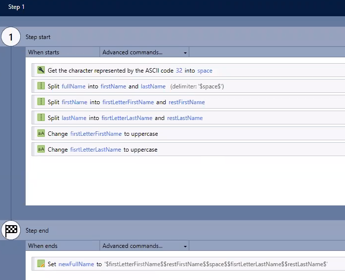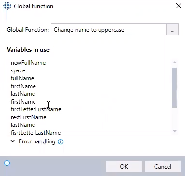 Making sure the first letter of the first and last name is capitalized is a task we want to have applied across different wizards / multiple times, for every excel file that contains full names. Therefore, we've created the whole repetitive process one time, as a global function. We started applying this global function in different wizards - whenever and wherever it is relevant. In one of the wizards, we decided that there is a need to backup the original names as well, as they were originally typed. Therefore, we added an additional relevant advanced command/adjustment into the Run-time Adjusment Zone of the Global Function