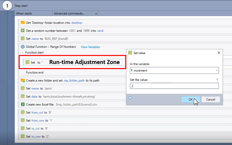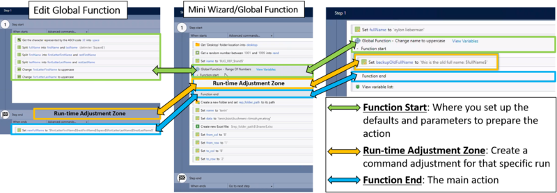 In the Global Function mini wizard, within the steps editor, you will see the default Global Function with only the ability to edit or add a run-time adjustment. In that area, the Run-time Adjustment Zone, you have the ability to create an adjustment, such as changing increments of a predefined value to 2, 4, 6. Such an adjustment will only be implemented on that specific run. This will make the wizard perform Step 1, and then it will take the added adjustment command which will influence the main action that will be performed in Step 2.