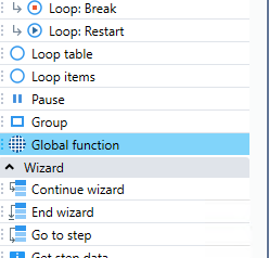 Optional: You can further customize the selected global function by adding to it more advanced commands. Any commands you drag into a global function in a wizard will be applicable only to this specific wizard.