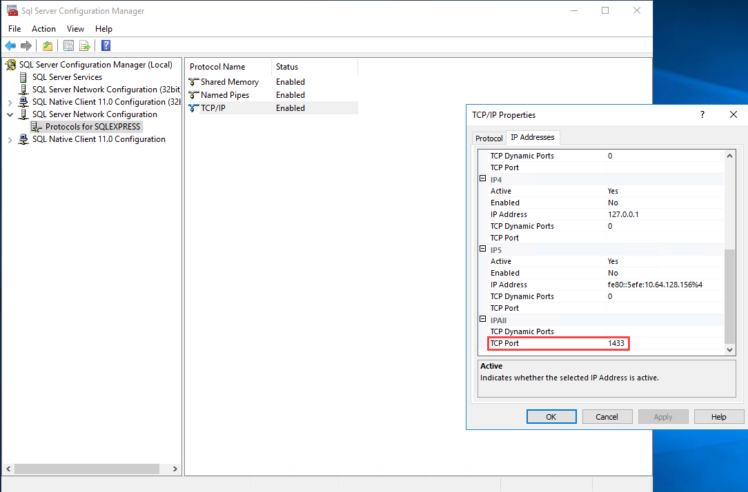 - Ensure the port used for the database connection is configured correctly. In SQL Configuration Manager, go to SQL Server Network Configuration > Protocols for [database instance name]. In the right pane, double click TCP/IP. In IP Addresses > IPAll section, make sure the TCP Port field has the value 1433 (or a port that your IT department has configured for database connections).