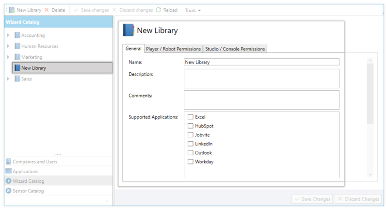 All wizards and sensors are housed on the Nintex RPAServer in the wizard and sensor catalogs, respectively. Libraries are the top level in the catalog’s hierarchy. Each library: