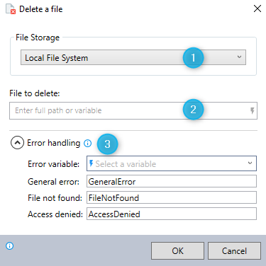 When adding a 'Delete a file' command, you have the option to select either the Local File System or SharePoint Online as the file storage location.
