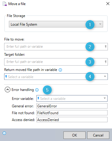 Return moved file path in variable: (optional): enter a new file path (move to target folder file) to store the new full path of the moved file in a variable for future use. Example: C:\LeoDest\Text.txt