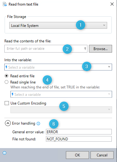 When adding a 'Read from text file' command, you have the option to select either the Local File System or SharePoint Online as the file storage location.