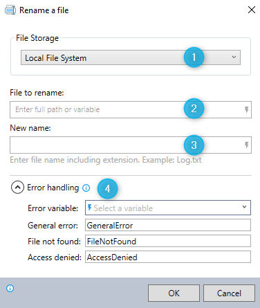 When adding a 'Rename a file' command, you have the option to select either the Local File System or SharePoint Online as the file storage location.