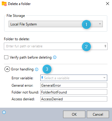 To ensure that the folder deletion is not executed when one of the variables in the path is empty, check the 'Verify path before deleting' option.