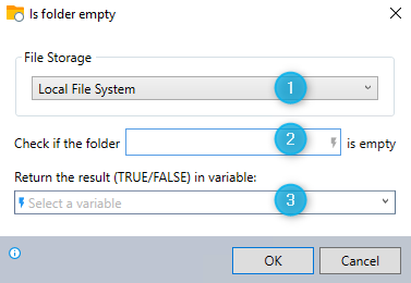 Enter the name of the variable where you would like to store the result of the check. The result will be either TRUE or FALSE, depending on whether the folder is empty or not.
