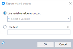 (Optional) Select a variable or create a new one to capture the task's output upon completion. This variable stores information generated by the automated task, which you can access using the Report wizard output advanced command.  This variable doesn't apply to messages displayed during the current sensor/wizard execution or for other advanced commands within the current wizard. But, you can use it for messages displayed after completing the task, as explained in the next step. This variable doesn't apply to messages displayed during the current sensor/wizard execution or for other advanced commands within the current wizard. But, you can use it for messages displayed after completing the task, as explained in the next step.