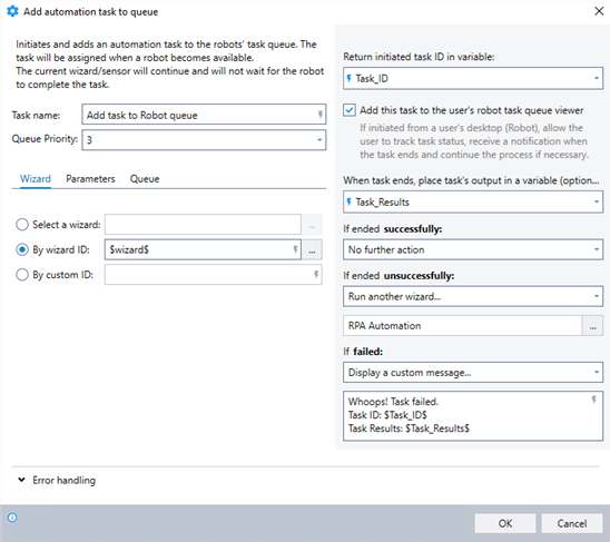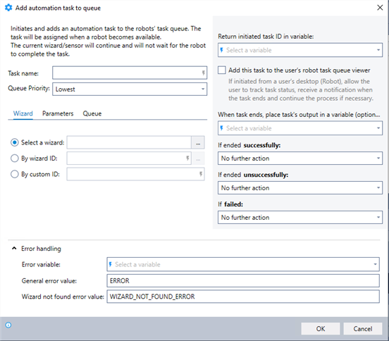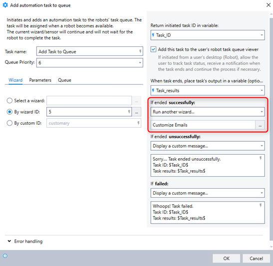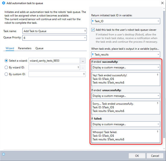 Add the Add automation task to queue command with the $wizard$ variable as the By wizard ID, and include logic to specify actions that the system will take based on different outcomes when the task completes, such as success, failure, or an error.