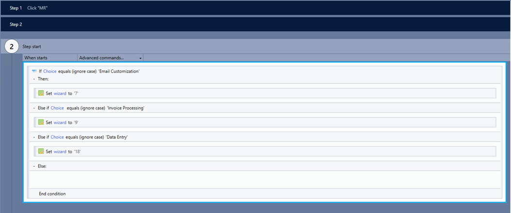 Add the If else command using the $wizard$ variable, to handle the user's response. This involves setting up logic to determine which wizard should start based on the user's selection.