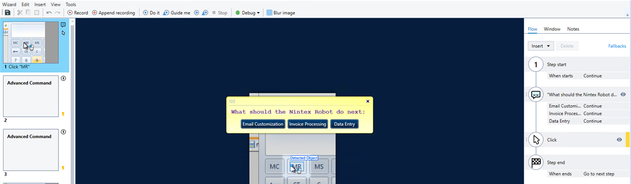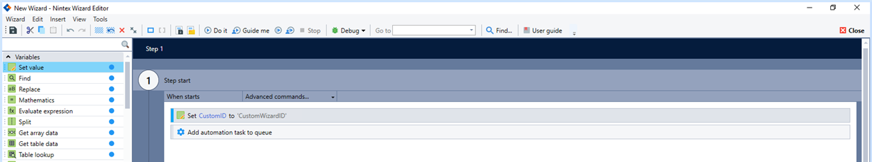 Switch to the Advanced command view in the Nintex Robot's Studio Wizard Editor.