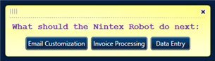 OutcomeThe execution of the wizard by the Nintex Robot results in an interaction with the Nintex Assistant user. Depending on the user's input, a different wizard task is initiated and added to the Nintex - Robot Task Queue. If the task ends successfully, no additional action is triggered. In case of an unsuccessful outcome, the RPA Automation wizard is launched. However, if the task fails, a custom message is displayed to notify the user.