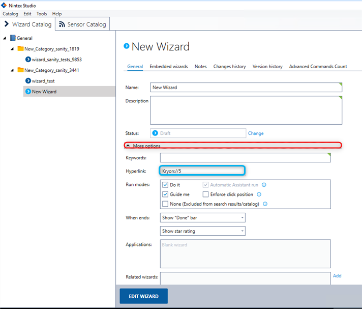 Enter the wizard's ID. To find the ID, open the wizard in the Catalog and expand the More options section. The ID is the number following the Hyperlink. For example, in the following image, the wizard ID is 5. Ensure the wizard's ID is exact to prevent a WIZARD_NOT_FOUND_ERROR message.