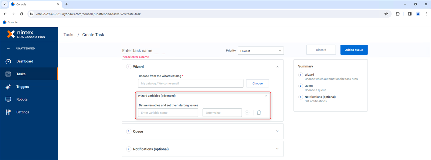 The Add automation task to queue Advanced command is part of the RPA commands, enabling various automation tasks within the RPA application. With this command, you can execute and add a task to the Console Task queue. It also supports a hybrid mode, where the Nintex Robot starts a task and can get input from the Nintex Assistant user. To incorporate this command into your automation workflow, drag it into a wizard using the Advanced command view in the Studio Wizard Editor.