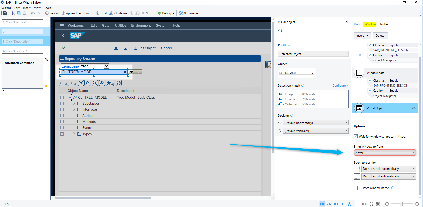 The SAP interfaces consist of various controls, each with its own set of capabilities. But, some limitations may apply when using SAP DACs in wizards. The table below shows scenarios where the SAP Scripting API poses challenges for different SAP elements. Additionally, where available, we've provided practical workarounds to navigate these limitations. SAP Element Description Limitations Workaround Line item table Displays a table of line items which contain sets of cells and provides options for selecting the items. The SAP Scripting API has limitations when dealing with certain tables. While it enables opening the table and clicking on table items, it doesn't support capturing the bounding rectangles of these items. Due to the Object Selector's difficulty in detecting a single cell in a table, we recommend using visual detection during the recording process as a workaround. Context menu Displays a list of options. It can have multiple child menus within a main menu. The SAP Scripting API has limitations when dealing with context menus. Although it enables opening the context menu and clicking on menu items, capturing the bounding rectangles of each item is not supported. Due to the Object Selector's difficulty in detecting a single element within the context menu, we recommend using visual detection during the recording process as a workaround. Menu Enables the selection of items from the SAP Menu. The SAP Menu is only available in the main SAP WinGUI window. The SAP Scripting API has limitations when dealing with menus. Although it enables opening the menu and clicking on menu items, capturing the bounding rectangles of each item is not supported. Due to the Object Selector's difficulty in detecting a single element within the menu, we recommend using visual detection during the recording process as a workaround. ALV table A type of SAP tables represented by a standard set of controls for elements displayed in a tabular structure. In certain cases, the ALV table may seem like two tables visually, even though it's technically one. Header information may also be part of the table structure, making it challenging to distinguish between cells. There's currently no known workaround. You can try using visual detection as an alternative. Simple tree A type of SAP tree represented by a list of elements organized in a tree structure. The SAP Scripting API has limitations when dealing with trees. Although it allows you to select the entire tree, it does not allow you to capture specific elements within the tree. Due to the Object Selector's difficulty in detecting a single element within the tree, we recommend using visual detection during the recording process as a workaround. List tree A type of SAP tree represented by a list of elements organized in a tree structure with lists in unorganized columns. The SAP Scripting API has limitations when dealing with trees. Although it allows you to select the entire tree, it does not allow you to capture specific elements within the tree. Due to the Object Selector's difficulty in detecting a single element within the tree, we recommend using visual detection during the recording process as a workaround. Column tree A type of SAP tree represented by a list of elements organized in a tree structure with organized columns. The SAP Scripting API has limitations when dealing with trees. Although it allows you to select the entire tree, it does not allow you to capture specific elements within the tree. Due to the Object Selector's difficulty in detecting a single element within the tree, we recommend using visual detection during the recording process as a workaround.  Visual detection Visual detectionFollow the steps below to use visual detection for the SAP elements that are not recognized with commands: SAP Win GUI must be added to the list of allowed applications in the Nintex Admin for this to be successful.-