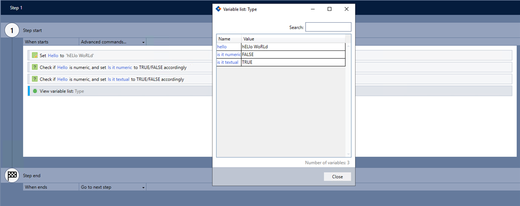 This example shows how to check if the value of the variable Hello is numeric or textual using the Check type command.