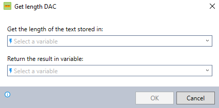 | Return the result in variable | The name of the variable to store the length result. | Enter the name of the variable or select an existing one. |