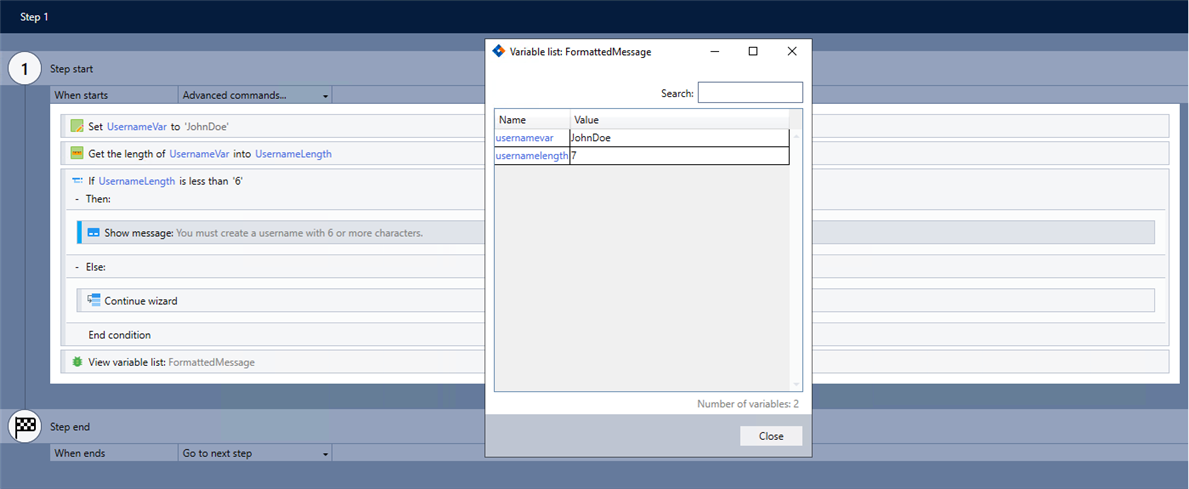 Drag the Show message command into the Then: container of the If else command and enter a Message: CopyYou must create a username with 6 or more characters.