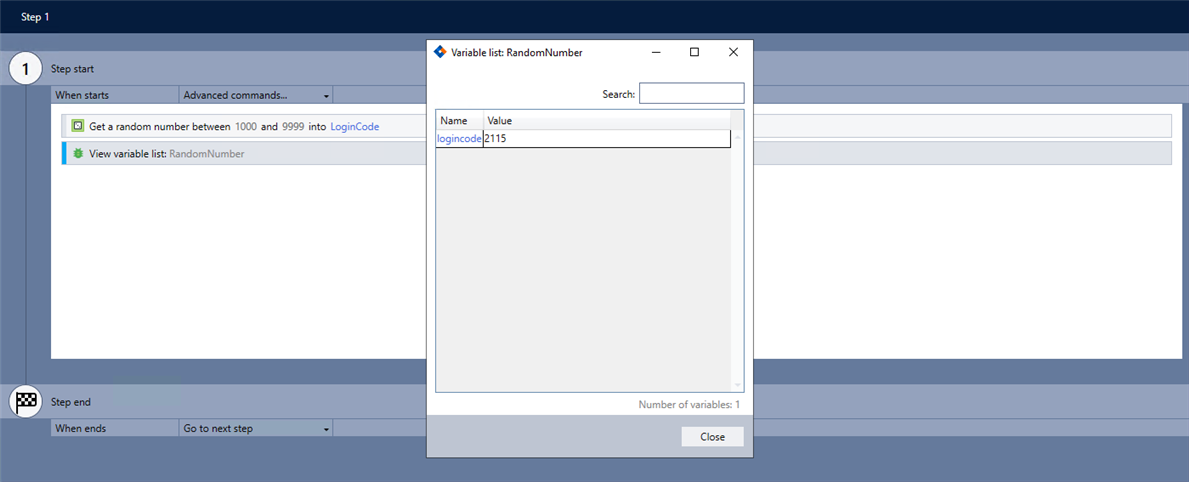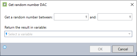 | Return the result in variable | The name of the variable to store the generated random number. | Enter the name of the variable or select an existing one to store the result. | |