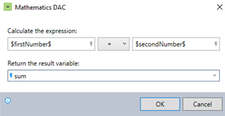 | First value | The first value or variable to use in the calculation. | Enter a numeric value, select an existing variable (e.g., $MyVar$), or create a new variable. Ensure values entered in the command are numeric. If one or both of the values entered is non-numeric, the wizard will return an empty result in the variable you have specified. (Numbers that include currency symbols are treated as non-numeric.) |