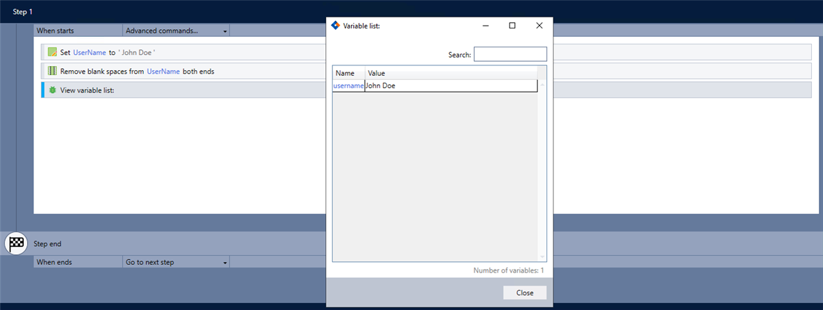 | Remove blank spaces from | The option to remove the blank spaces from the beginning, end, or both ends of the variable. | Choose where to remove spaces from in the variable: