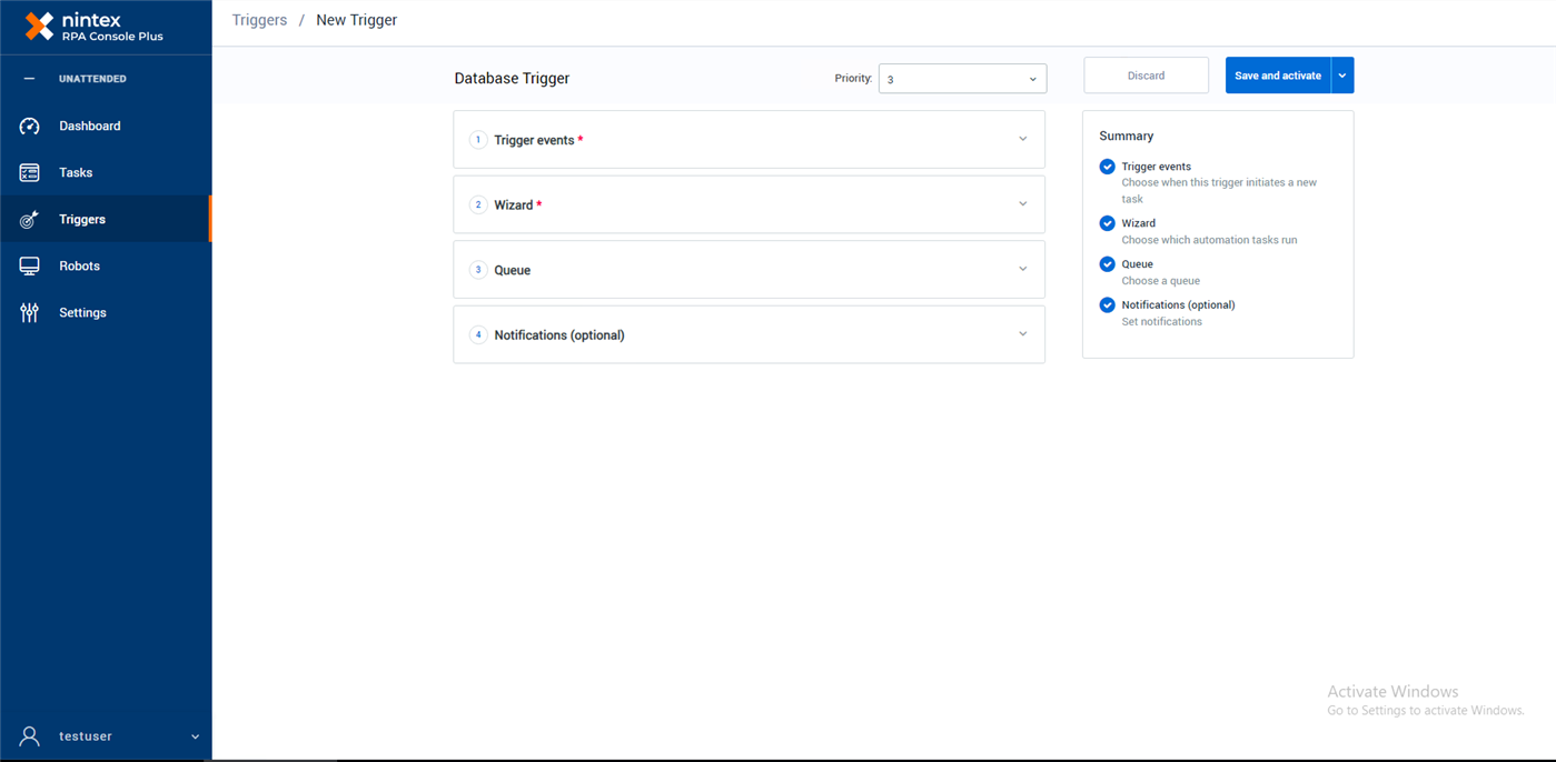 Create a database trigger in the RPA Console Plus to initiate a new task whenever database records are inserted, updated, or deleted.