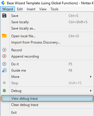 You can debug with Do it or Do it from this step, to check the steps of the wizard. Open the wizard from the Wizard Catalog in the Nintex Studio and select Debug: