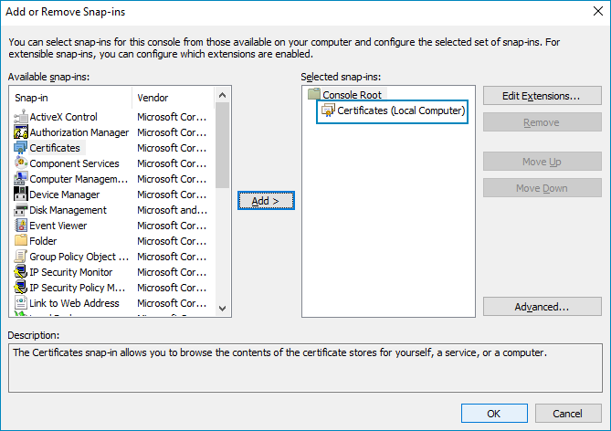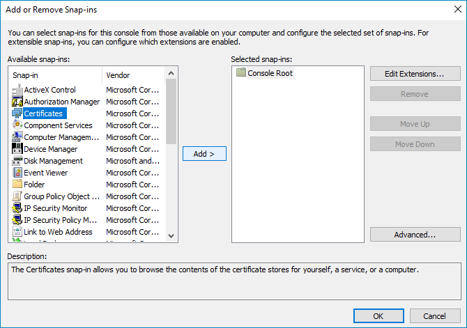 The Certificates snap-in will now appear in the left-hand column of the Add or Remove Snap-ins window under Console Root.