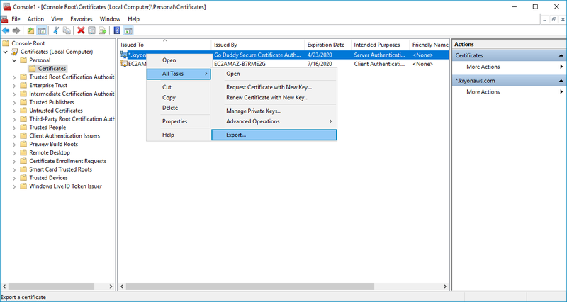 Right-click on the relevant certificate, select All Tasks > Export...