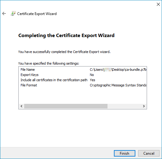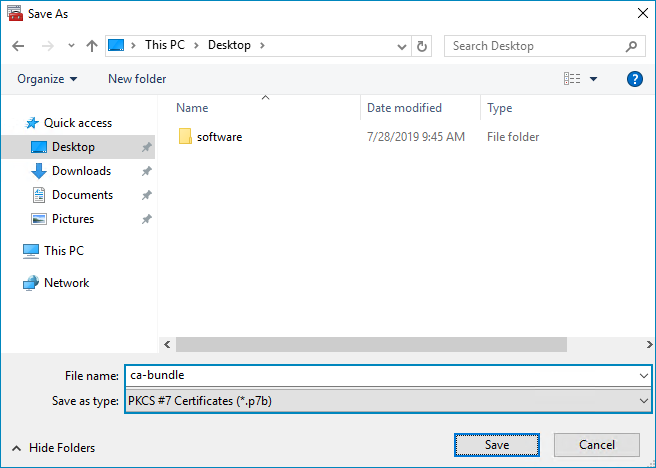Select the Cryptographic Message Syntax Standard - PKCS #7 Certificates (.P7B) file format.
