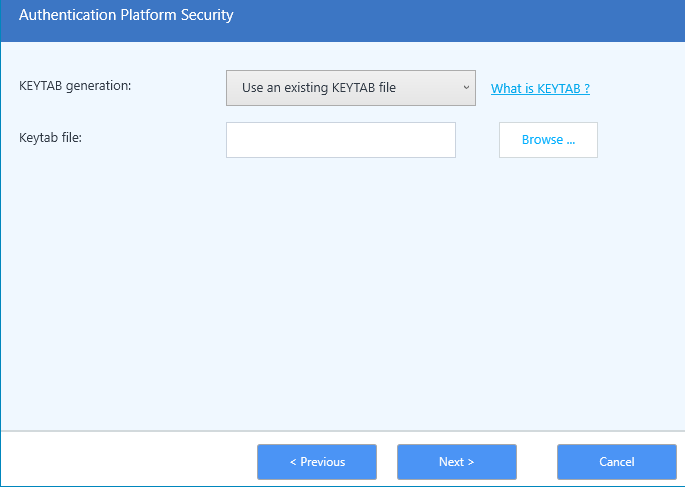 KEYTAB generation: Select the option by which you will provide the KEYTAB file required for Kerberos.