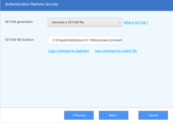 Copy command to clipboard / Save command to a batch file:Use one of these options to generate the script that allows you to generate a KEYTAB file later.