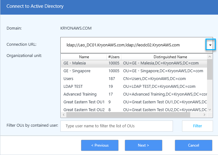 Filter OUs by contained user: (Optional) Type a user name in this field to filter the list of available OUs to show only the one that contains a specific user, then click the Filter button to activate the filter.