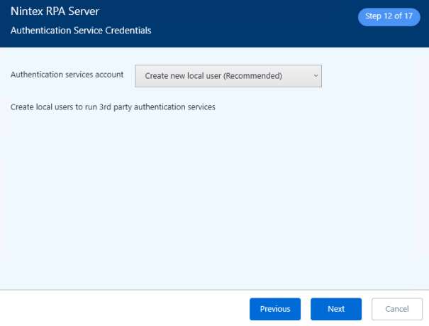 Create new local user: The installation package creates a new local user especially for the purpose of running authentication services (for username and password deployments only).