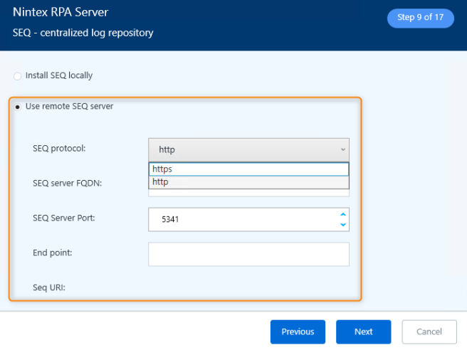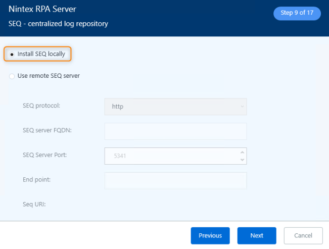 Select Use remote SEQ server if you have installed Seq on a different server. Before providing the information of the remote Seq, we recommend you run the Nintex's Seq Installation Wrapper on the server Seq is installed on. The wrapper wraps Seq with Nintex's configuration and allows establishing a successful connection between the RPA Server and the remote Seq.