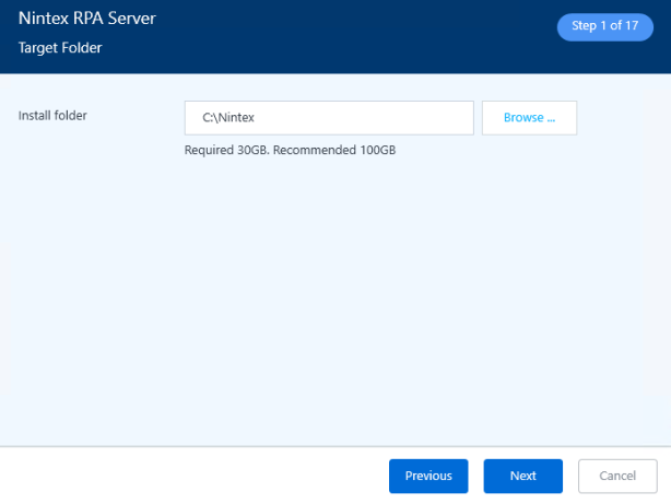 The installer automatically shows the folder to which the Nintex RPA Server files should be installed. The default value is Nintex on the local drive with the most free space.