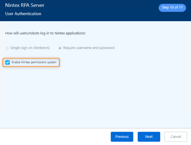 Enable Nintex permissions system: Select this checkbox to enable Nintex's internal permissions system (enables the assignment of read/write/publish permissions to Studio users and robots for specific libraries/categories of automation workflows).