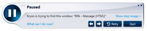 You recorded a wizard for creating a new mail message and typing its content. If, while playing the wizard, the user changes the subject of the message before the wizard reaches this step in the flow, the message's window caption is changed. In this scenario, the robot looks for a window called RPA - Message (HTML) but cannot find it because the caption was changed by the user. If the Raise error message fallback was applied to this step, it is activated and a Paused message appears on the user's screen: