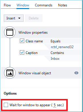 If you want the robot to wait some extra time for the step's specified window to appear before failing window detection, tick the Wait for window to appear checkbox and specify the maximum wait time. If the window does not appear by the time specified, the step's fallbackcommand will be executed. If the window appears before the maximum time is up, the wizard will immediately continue without waiting the remaining time.
