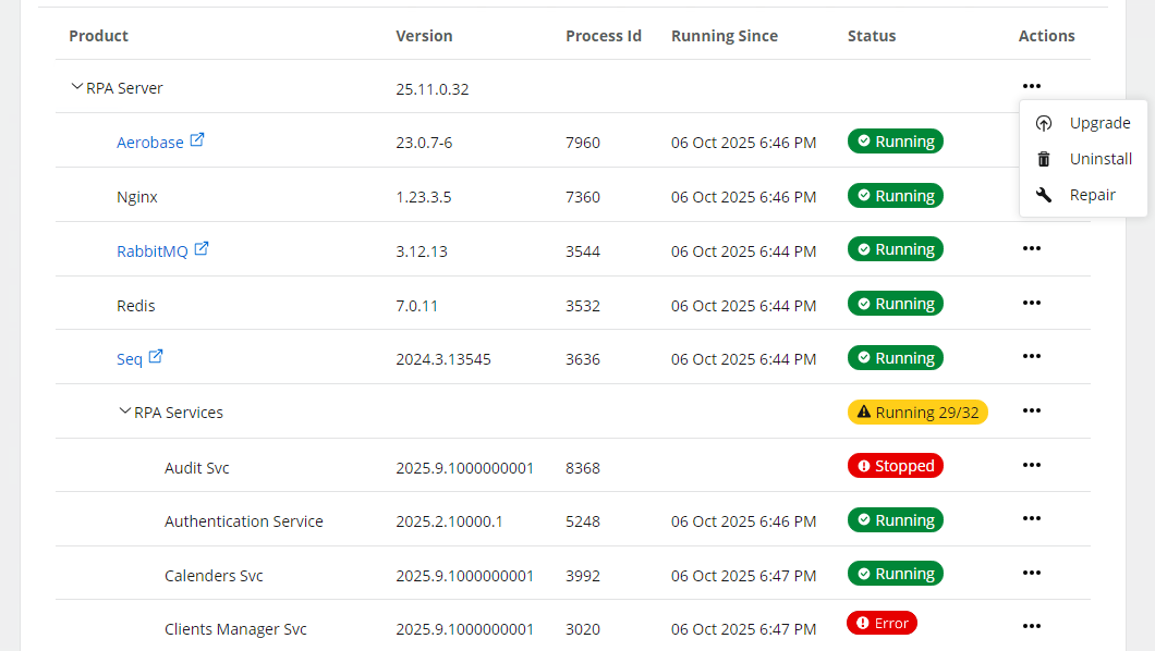 The System Manager provides tools to monitor and manage the RPA server for machine-level services like RabbitMQ, Redis, and Seq. This feature allows you to: