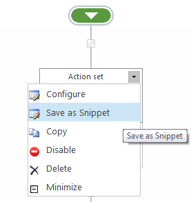 To save an action set as a snippet, activate the drop down menu on the action title bar and click Save as Snippet. For more information, please refer to the Workflow Snippets.
