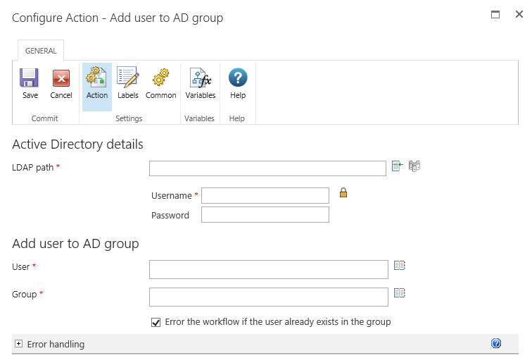 This workflow action will add a user to an Active Directory security group.