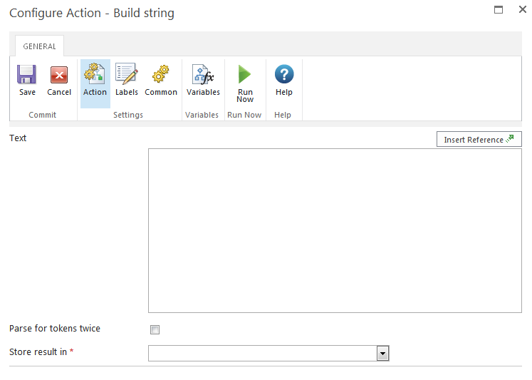 The result of the string that is built at runtime will be stored in a text Workflow variable that is selected from this list.