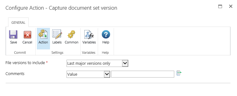 This workflow action saves a version of the current properties and documents in a document set.