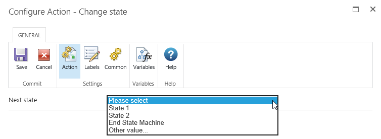 If the state named in the Change state action does not exist in the state machine, then the following workflow error occurs: "Selected value '[name]' is not recognized as a known state value."