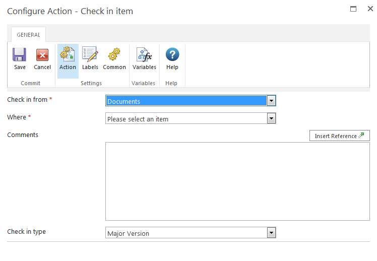 This action allows the workflow to check-in an item that was checked out with the Check out item action.