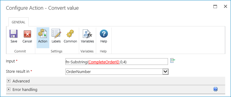 A common scenario for using this action is using it with an Inline function or the result of a query that returns a text string that contains a number, and that number needs to be stored into a number field of a SharePoint list. The value cannot be stored into a number field while the value is stored in a text variable. The example in the screenshot demonstrates processing a text variable by using an Inline function to extract the first 4 characters (maybe the variable contains 1234-XXAB). These first 4 characters will then be interpreted and stored into a number variable.