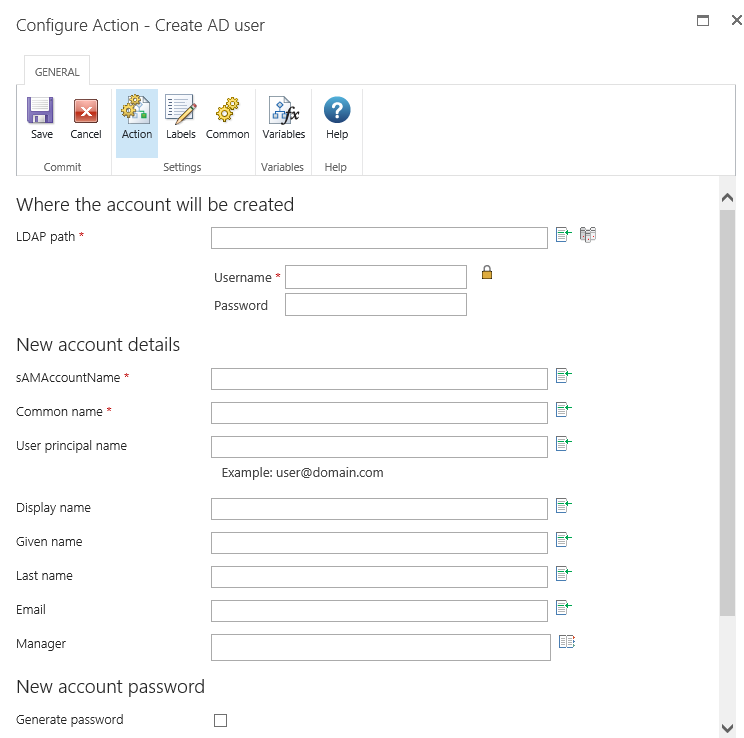 This workflow action will create an Active Directory user account in the specified LDAP location.