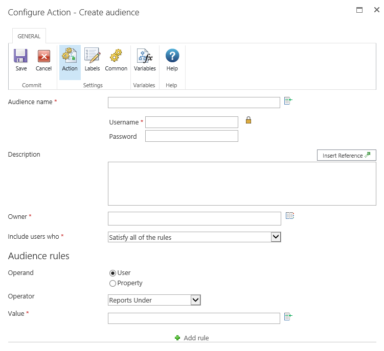 The name of the new audience. The value can be added either manually or built up dynamically at run time using Insert Reference