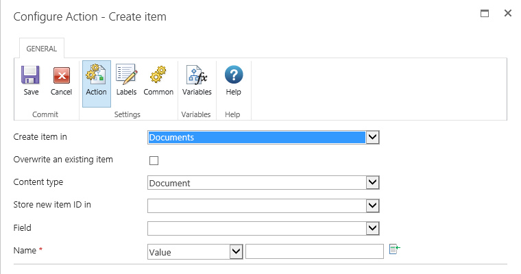 Available fields that can be added to the created item will be dependent on what fields have been created in the destination list. For each field in the drop down list, a value can be added either manually or based on a dynamic element provided by Insert Reference